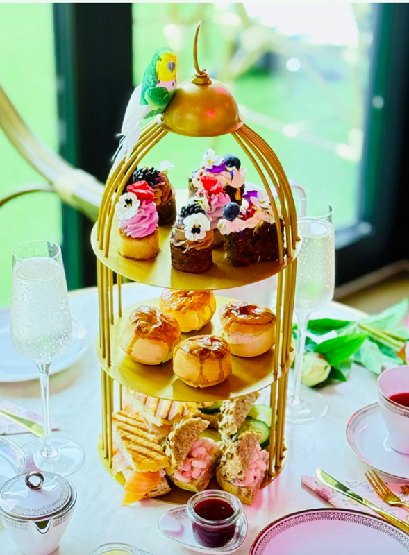 Nyd et smukt etagestativ med scones, små sandwiches, søde kager og udsøgt te.